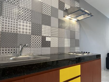 -Amueblado con:- Sala con smart tv y comedor para 4 personas con aire acondicionado y ventilador- Cocina integral: campana, alacena, gavetas, parrilla eléctrica, refrigerador, microondas.