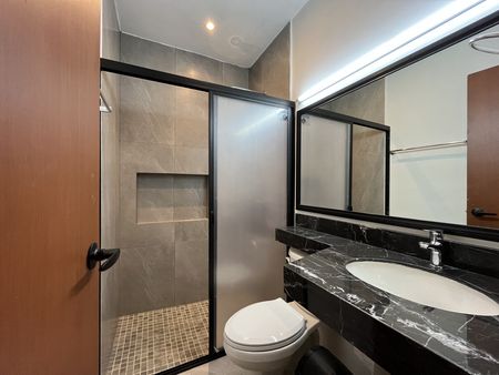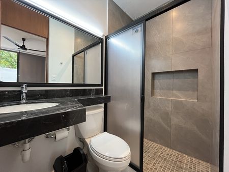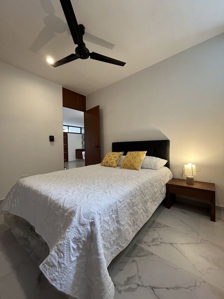 - 2 recámaras cada una con: cabecera, cama matrimonial, aire acondicionado, ventilador, clóset con gavetas, buró y persianas black out- 2 baños completos